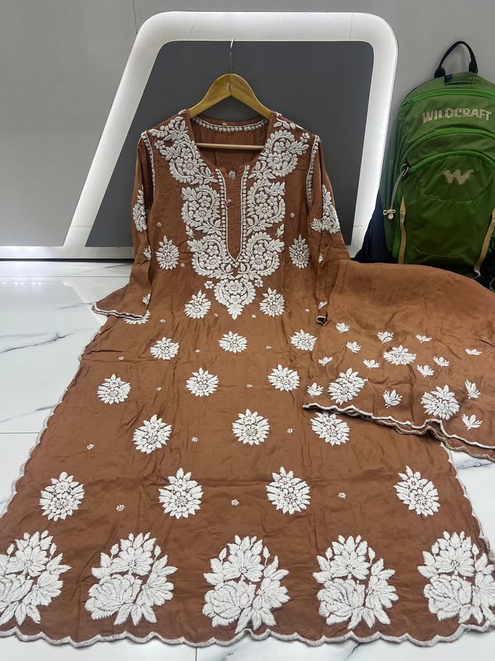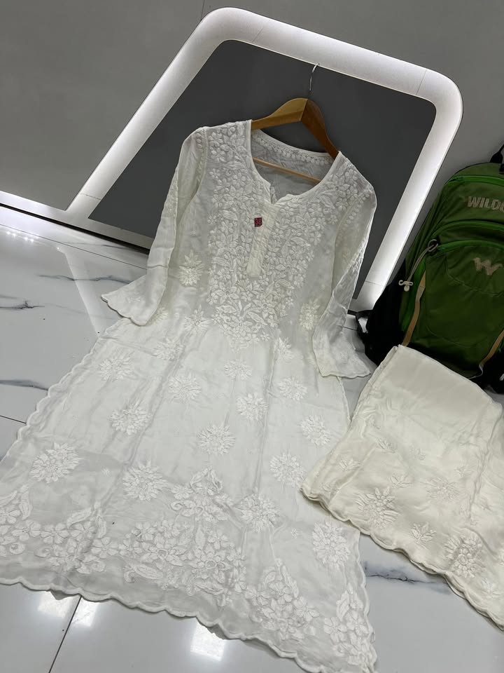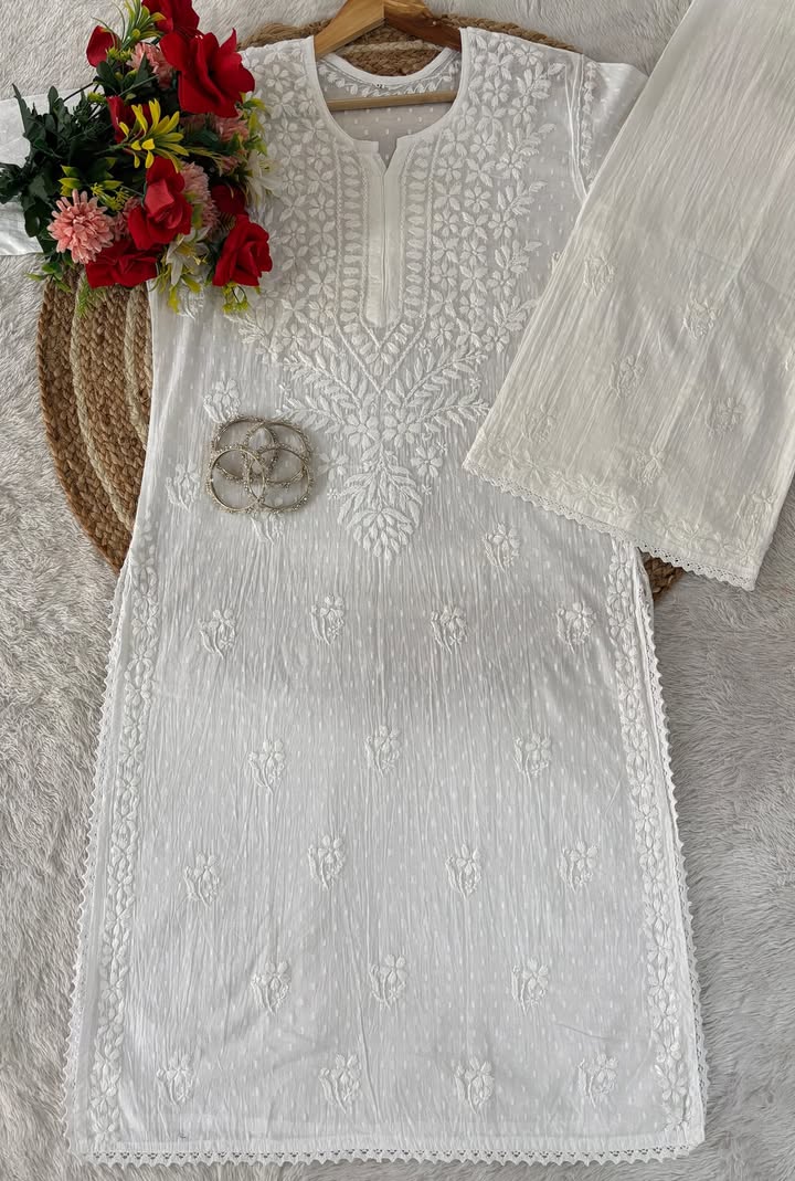 #3587 Lucknowi chikankari dobby cotton kurti with plazo lace design set