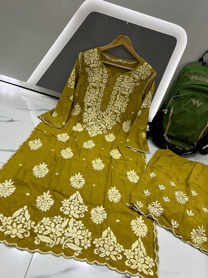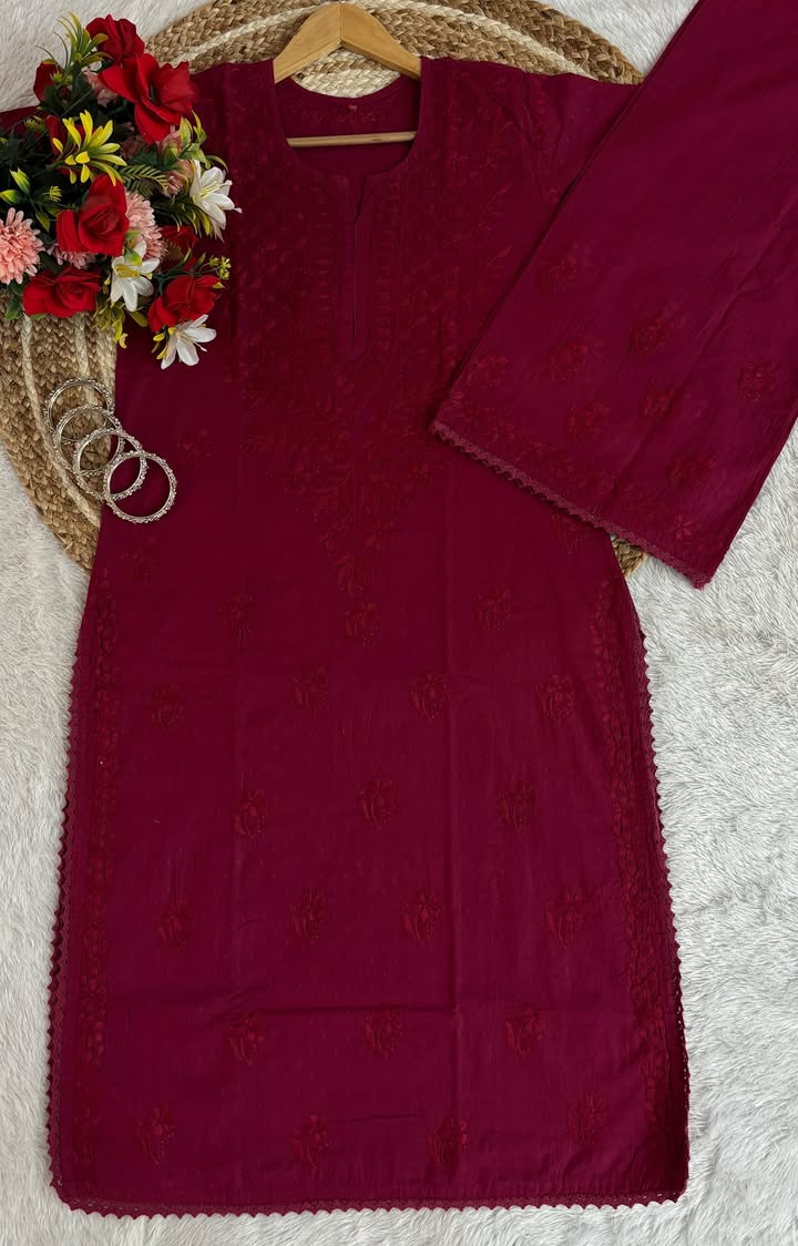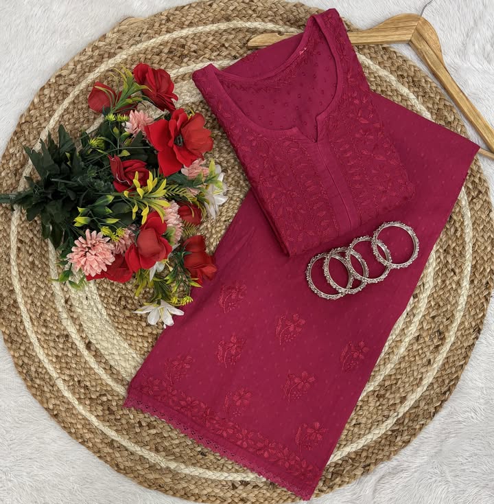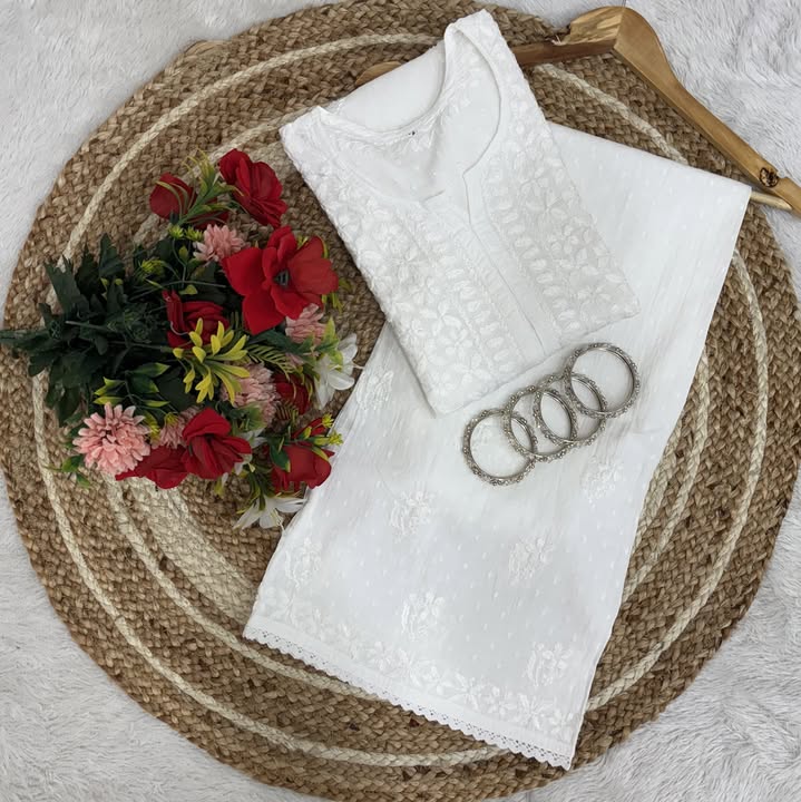 #3587 Lucknowi chikankari dobby cotton kurti with plazo lace design set